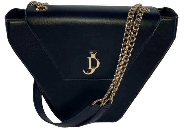 Gold metal hardware JD at front as clasp